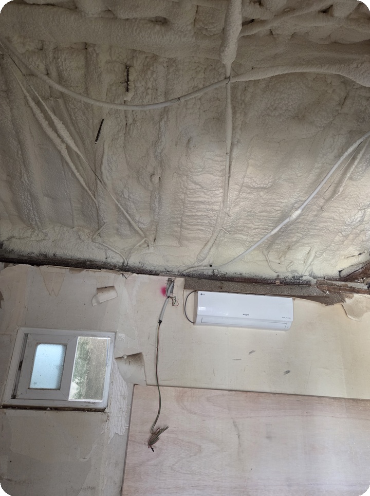 이러한 구조에서는 일반적인 단열재 부착 방식보다 고성능 분사형 단열재, 특히 준불연 우레탄폼 시공이 가장 효과적입니다.